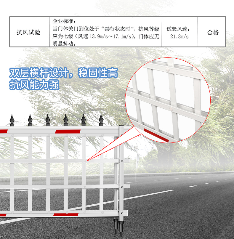 標(biāo)配防風(fēng)座,固定閘桿支撐腳,遇強(qiáng)風(fēng)有效減小閘桿損壞幾率